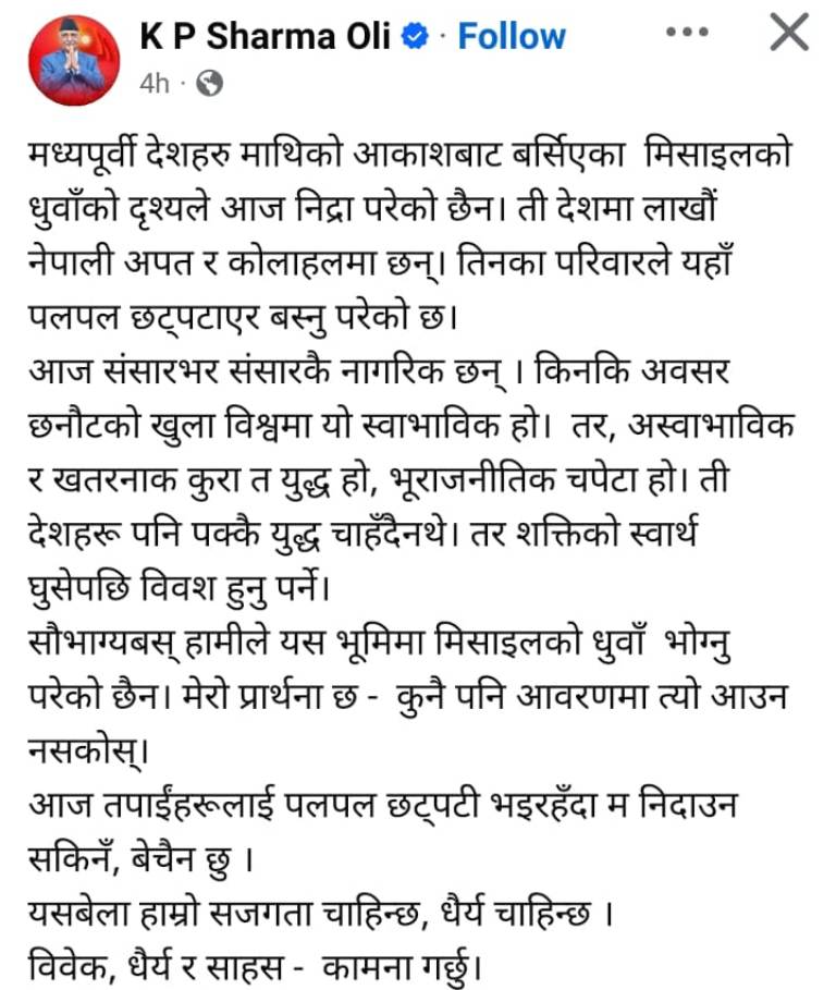 ओलीले सामाजिक सञ्जालमार्फत व्यक्त गरेको भनाइमा युद्धको विभीषिका, भूराजनीतिक टकराव र शक्तिराष्ट्रहरूको स्वार्थका कारण सामान्य नागरिकले भोग्नु परेको पीडाप्रति गम्भीर चिन्ता प्रकट गरिएको छ । ‘मध्यपूर्वी देशहरू माथिको आकाशबाट बर्सिएका मिसाइलको धुवाँको दृश्यले आज निद्रा परेको छैन’ भन्दै उनले सुरु गरेको अभिव्यक्तिमा ती देशमा रहेका लाखौं नेपाली अप्ठ्यारो र कोलाहलको बीचमा रहेको उल्लेख छ ।